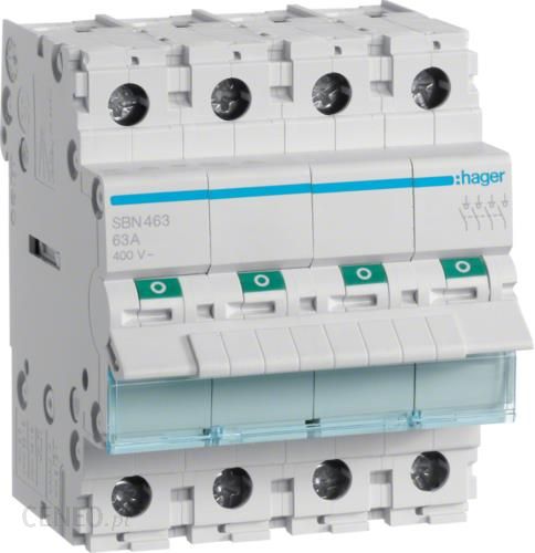 Modułowy rozłącznik izolacyjny, 4P 63A Firma Hager to lider systemów instalacji elektrotechnicznych dla domów, biur i powierzchni przemysłowych. W ofercie posiadamy nie tylko bogatą gamę łączników i gniazd, ale również rozwiązania z zakresu rozdziału energii. Są to produkty wysokiej jakości, które charakteryzuje ponadczasowy design, różnorodność wzorów, kolorów, kształtów oraz wysokie walory estetyczne i ultranowoczesne wzornictwo. Dane technicznePrąd znamionowy:63Ilość biegunów:4 PIlość modułów:4Znamionowe napięcie robocze Ue (AC):230/400Znamionowe napięcie izolacji Ui:440Znamionowe napięcie udarowe wytrzymywane Uimp:6000Częstotliwość:50/60 HzCałkowite straty mocy dla prądu znamionowego:9 WWytrzymałość mechaniczna (ilość cykli):60000Temperatura pracy:-20 to 50 °CTemperatura magazynowania:-40 to 80 °CWysokość zainstalowanego produktu:83 mmSzerokość zainstalowanego produktu:70 mmGłębokość zainstalowanego produktu:69 mmModułowe rozłączniki izolacyjne i przełączniki zasilania Hager to nowe aparaty o prądach znamionowych od 16 do 125 A, umożliwiające łatwe i bezpieczne wykonywanie czynności łączeniowych w rozdzielnicach niskiego napięcia. Posiadają szereg udogodnień, takich jak energooszczędna dioda sygnalizacyjna LED czy też możliwość dobudowy styku pomocnicznego. Prosta obsługa i dokładność działania to cechy cyfrowych zegarów sterujących. Programowanie zegarów może być przygotowane poprzez dedykowane oprogramowanie i przenoszone do urządzenia za pomocą kluczy programujących. Nowoczesne, energoszczędne i jeszcze łatwiejsze w montażu – to nowe, pełne serie styczników i przekaźników instalacyjnych Hager, których parametry techniczne zaspokajają potrzeby współczesnych instalacji elektrotechnicznych.Do rozłączania wszystkich typów obwodów prądowych. Zgodność z: PN-EN 60943-3 dla całego zakresu oraz PN-EN 60669-1 dla zakresu od 16 A do 63 A.CharakterystykaWszystkie rozłączniki posiadają zielone/czerwone pola na dźwigni napędu zapewniające czytelną wizualizacje pozycji rozłącznika.Dane techniczneKategoria użytkowania AC22A230 V / 400 VIe: 16A do 32A rozmiar 1.Zaciski przyłączeniowe:16 mm? – drut10 mm? – linkaIe: 32 A do 63 A rozmiar 2.Zaciski przyłączeniowe:25 mm? – drut16 mm? – linkaIe: 63 A do 125 A rozmiar 3.Zaciski przyłączeniowe:50 mm? – drut35 mm? – linkaZaprezentowane zdjęcie ma charakter poglądowy. Wygląd produktu może nieznacznie różnić się od zdjęcia….