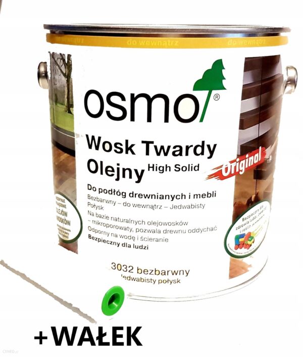 OSMO 3032 WOSK TWARDY OLEJNY ORIGINAL JEDWABISTY POŁYSK 10 litrów+ GRATIS profesjonalny wałek z mikrofibry (szerokość 10 cm) do uchwytu o średnicy 6 mm (standardowy).ZALETY- Niezwykle trwały i wytrzymały- Odporny na działanie potu i śliny, odpowiedni dla zabawek dziecięcych- Dopasowany do potrzeb drewna, tworzy mikroporowatą powłokę- Odporny na plamy z kawy, wina i coli- Możliwa częściowa renowacji powłokiZASTOSOWANIAWosk Twardy Olejny Original jest przeznaczony do zabezpieczania wszystkich podłóg drewnianych:z desek warstwowych, litych i pokładowych, płyt OSB i podłóg korkowych, a także mebli.NAKŁADANIE RĘCZNEPowierzchnia gotowa w 2 dni, 2 powłoki1. Pierwsza warstwa na surowe, wyszlifowane drewno ok. 35 ml/m2.2. Błędy w aplikacji można skorygować na mokrej podłodze w ciągu 30 minut od momentu naniesienia pierwszej warstwy.3. Czas schnięcia ok. 8 – 10 godzin w normalnych warunkach (23°C / 50% wilgotności względnej). Niższe temperatury i/lub wyższa wilgotność mogą wydłużyć czas schnięcia. Zapewnić dobrą wentylację.4. Wyschniętą powierzchnię między nakładaniem warstw można oszlifować drobnoziarnistym papierem ściernym (P400) lub padem.5. Druga warstwa ok. 35 ml / m2.6. Czas schnięcia ok. 8 – 10 godzin; patrz punkt 3.