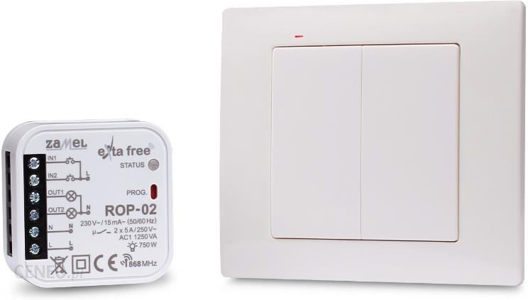 Bezprzewodowy zestaw sterowaniaExta Free RZB-04 (RNK04+ROP02)Najważniejsze cechydwa przekaźniki wyjściowe (wyjścia napięciowe 230 V AC)sterowanie pracą oświetlenia, ogrzewania, innych odbiornikówłatwy montaż w puszce podtynkowej fi60 mmpięć trybów pracy: załączenie, wyłączenie, tryb monostabilny, bistabilny, czasowy (opóźnione wyłączenie)duży zasięg działania (do 200m)sygnalizacja optyczna działanianiski pobór mocy, możliwość pracy ciągłejmożliwość zwiększenia zasięgu działania poprzez zastosowanie retransmitera RTN-01UWAGA! Podany zasięg działania dotyczy przestrzeni otwartej, czyli warunków idealnych, bez przeszkód. Jeżeli pomiędzy nadajnikiem a odbiornikiem znajdują się przeszkody, należy przewidzieć zmniejszenie zasięgu działania odpowiednio dla: cegła od 10 do 40%, drewna i gipsu od 5 do 20%, betonu zbrojonego od 40 do 80%, metalu od 90 do 100%, szkła od 10 do 20%. Negatywny wpływ na zasięg działania mają też napowietrzne i podziemne linie energetyczne dużej mocy oraz nadajniki telefonii komórkowej umieszczone w bliskiej odległości urządzeń.Opis przedmiotuKompletny zestaw sterowania bezprzewodowego (radiowy nadajnik klawiszowy 4-kanałowy RNK-04 oraz radiowy odbiornik dopuszkowy 2-kanałowy ROP-02).Zestawy sterowania bezprzewodowego to gotowy do pracy komplet urządzeń nadawczo-odbiorczych, umożliwiających realizację funkcji sterowania bezprzewodowego w ramach systemu EXTA FREE. Dodatkowo, w każdym momencie możliwe jest zaprogramowanie innego nadajnika lub odbiornika systemu EXTA FREE – nie występującego w zestawie. Funkcjonalność ta rozszerza możliwości zastosowania zestawów, realizację dodatkowych aplikacji, itp.WielkośćSpecyfikacjaZnamionowe napięcie zasilania nadajnika: 3 V DCZnamionowe napięcie zasilania odbiornika: 230 V ACTyp baterii nadajnika: CR2032Częstotliwość: 868 MHzKodowanie: transmisja z adresacjąIlość kanałow nadajnika: 4Ilość kanałów odbiornika: 2Zasięg działania nadajnika: 250 mZasięg działania odbiornika: 250 mStopień ochrony nadajnika: IP20Stopień ochrony odbiornika: IP20Maksymalny prąd przekaźnika: 5 AMaksymalne napięcie przekaźnika: 250 V ACMaksymalna moc przekaźnika: 1250 VAStyki: 2 NOKategoria użytkowania: AC1